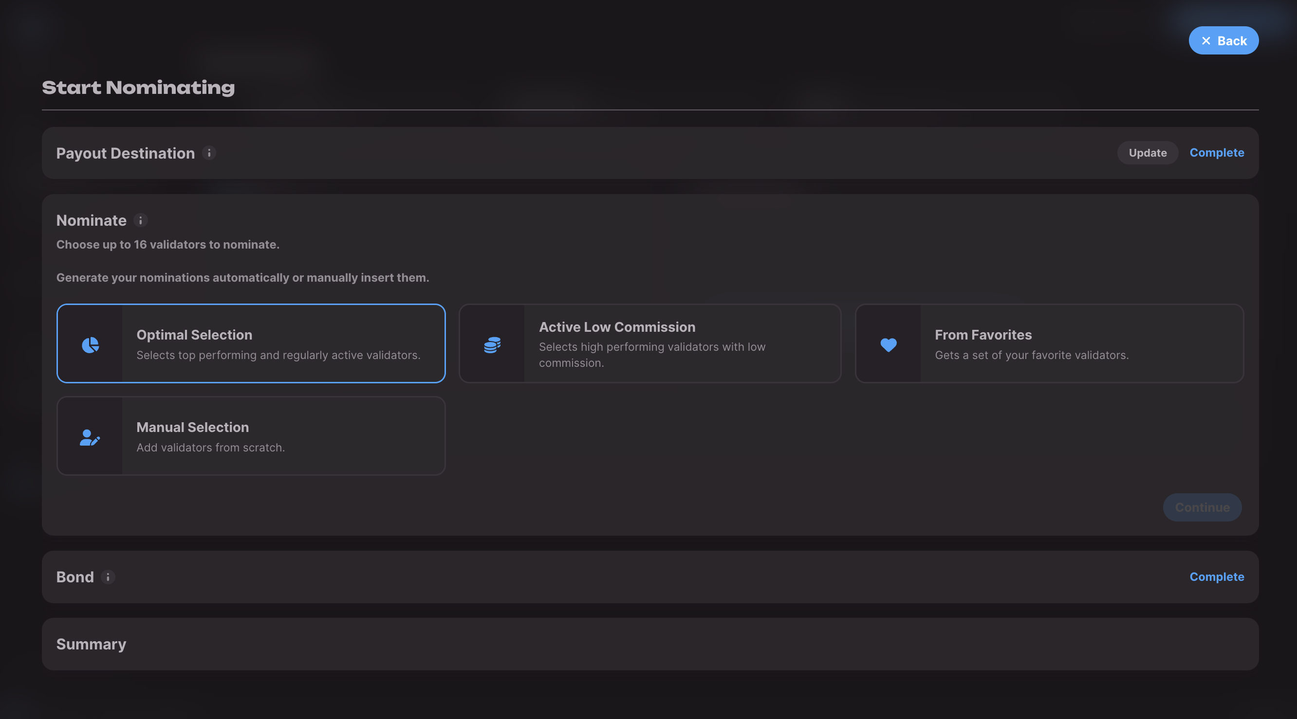 - Optimal selection: Allow the dashboard to simplify the whole process and fetch a list of upto 16 validators for you to nominate.